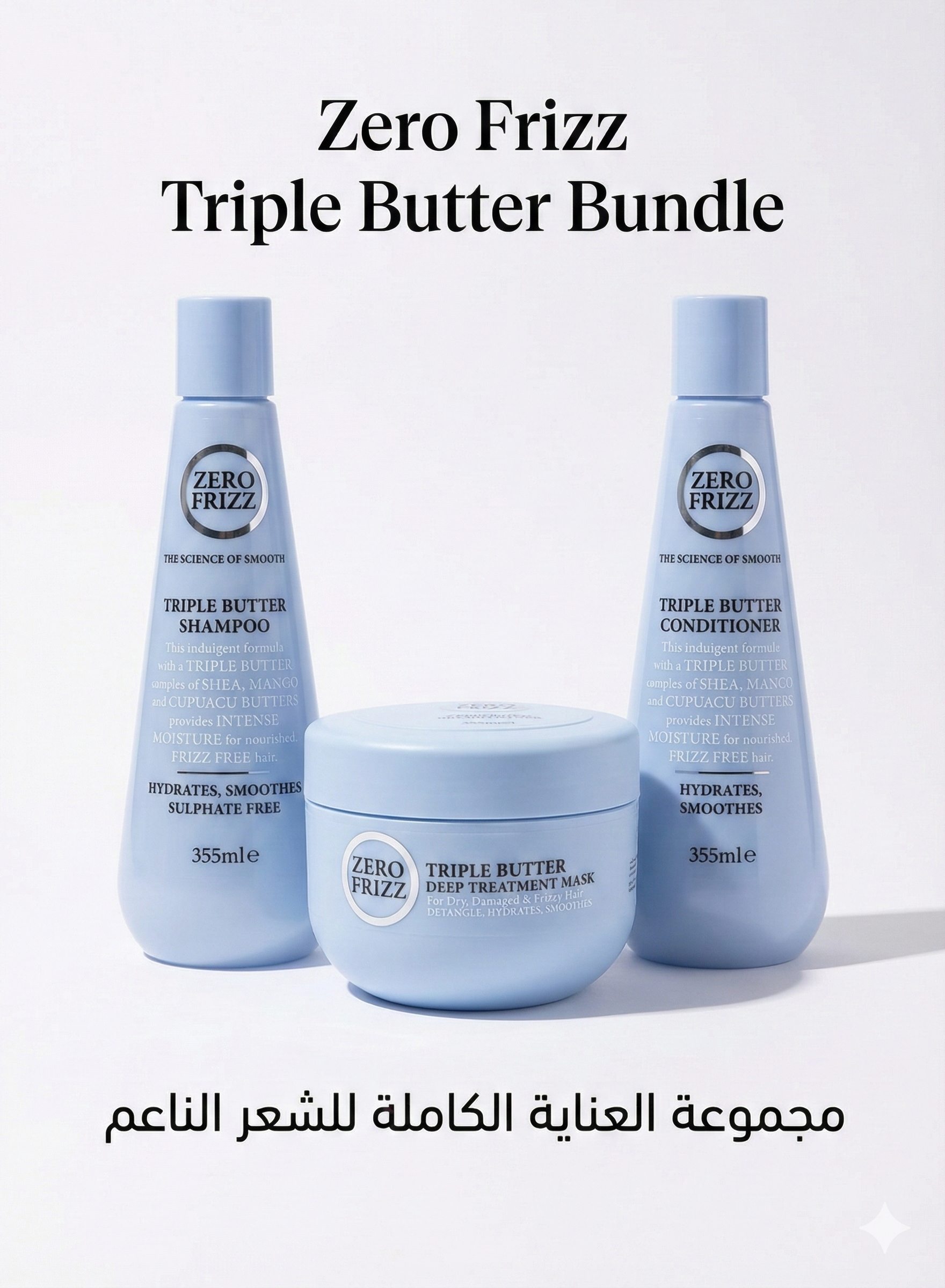 - شامبو تريبل باتر (355 مل): تركيبة خالية من الكبريتات، تُنظّف الشعر بلطف مع الحفاظ على زيوته الطبيعية. تُهيئ بشرة الشعر لامتصاص أقصى قدر من الرطوبة.